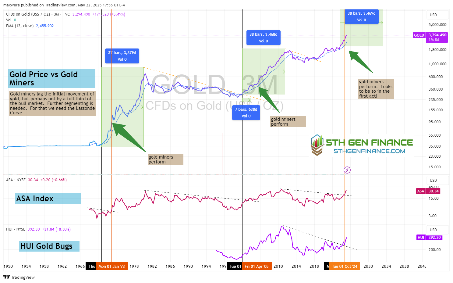 Gold miner data is spotty at best. Companies come and go. Dilution is the norm in bear markets. The chart would appear to suggest it makes an appearance around the time silver does. That is our starting thesis, at least.