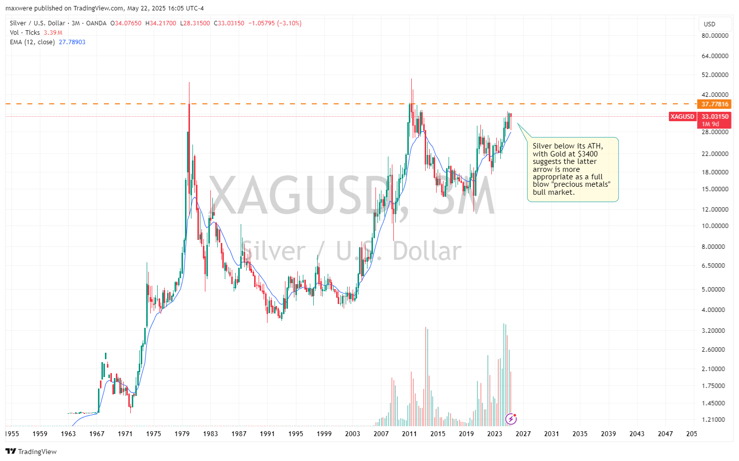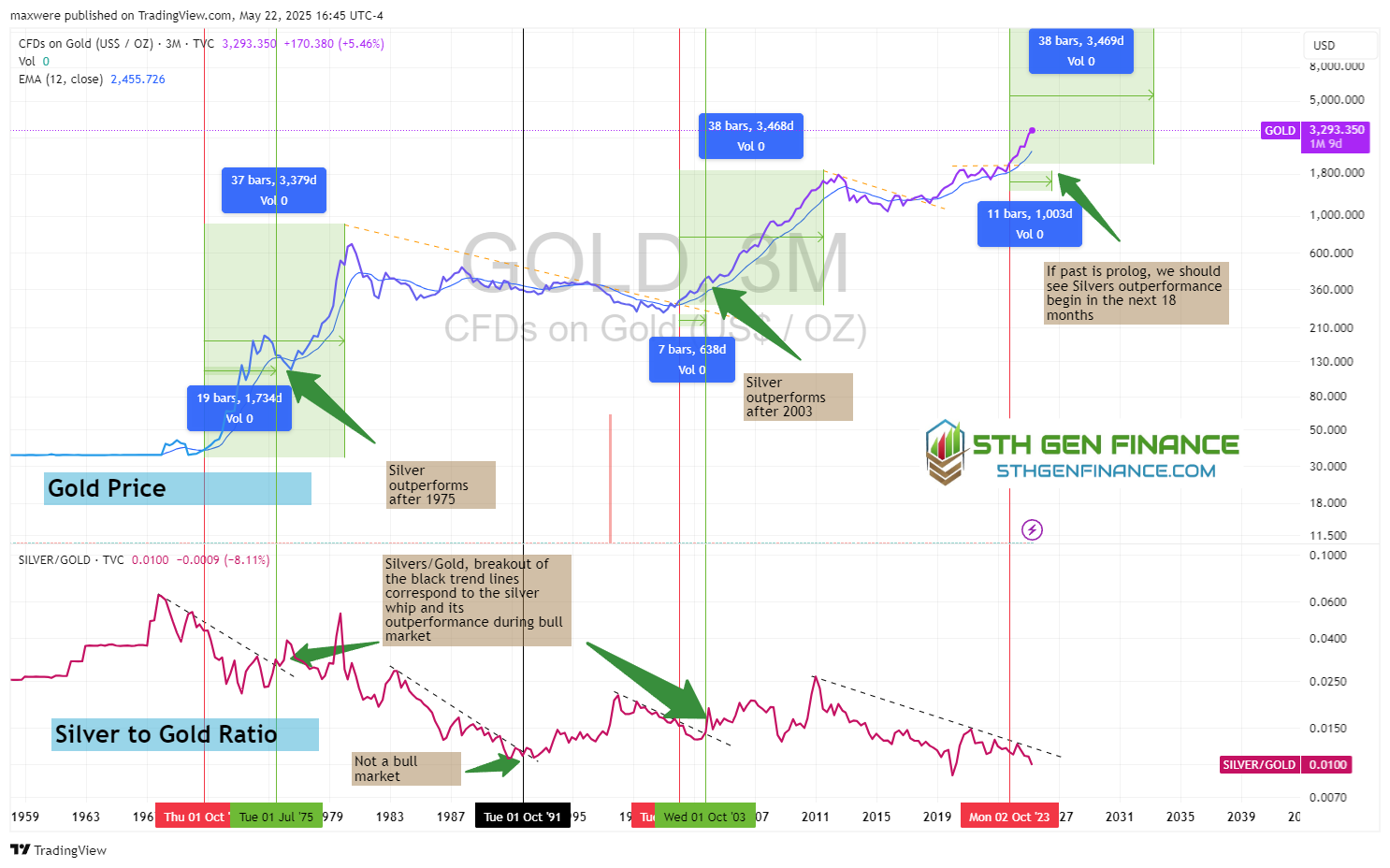 Above is the long-term price of gold with the ratio of silver to gold below. If this is a 3-act performance, look for silver to show up after or near the end of the 3rd act.