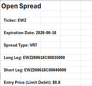 Initiating EWZ 0.00%↑ on the commodity accelerator portfolio.