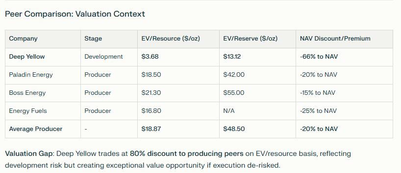 Deep Yellow Limited (ASX:DYL) represents a compelling value opportunity in the uranium development space, trading at a 66% discount to conservative Net Asset Value despite owning the world’s largest uranium resource base among ASX-listed companies (381.2 Mlb U₃O₈). The company’s flagship Tumas Project in Namibia is shovel-ready with completed DFS showing robust economics, while maintaining an exceptional balance sheet with A$194M cash, zero debt, and a 34-month cash runway requiring no equity dilution for at least 12 months.