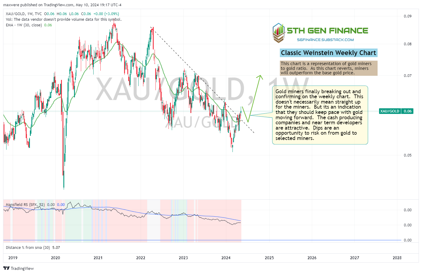 Now lets consider the price valuation of the broad gold miner/producer sector to the precious metal itself. Miners and Silver generally lag gold. This weekly close marked a confirmed second candle in a triangle breakout. I expect a head and shoulders pattern to form on this chart over the next 2-3 months.