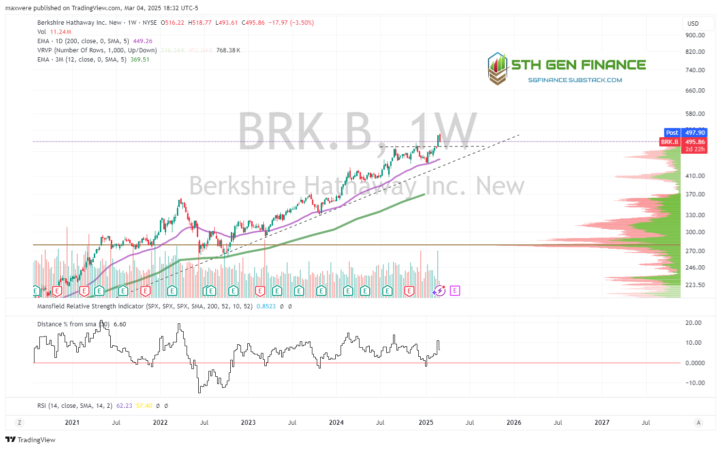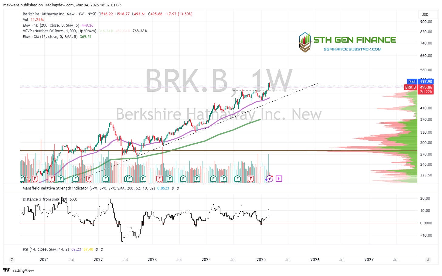 BRK.B - strongly in stage 2 uptrend. Looks quite bullish. Broke out last week. This one is strong for now!