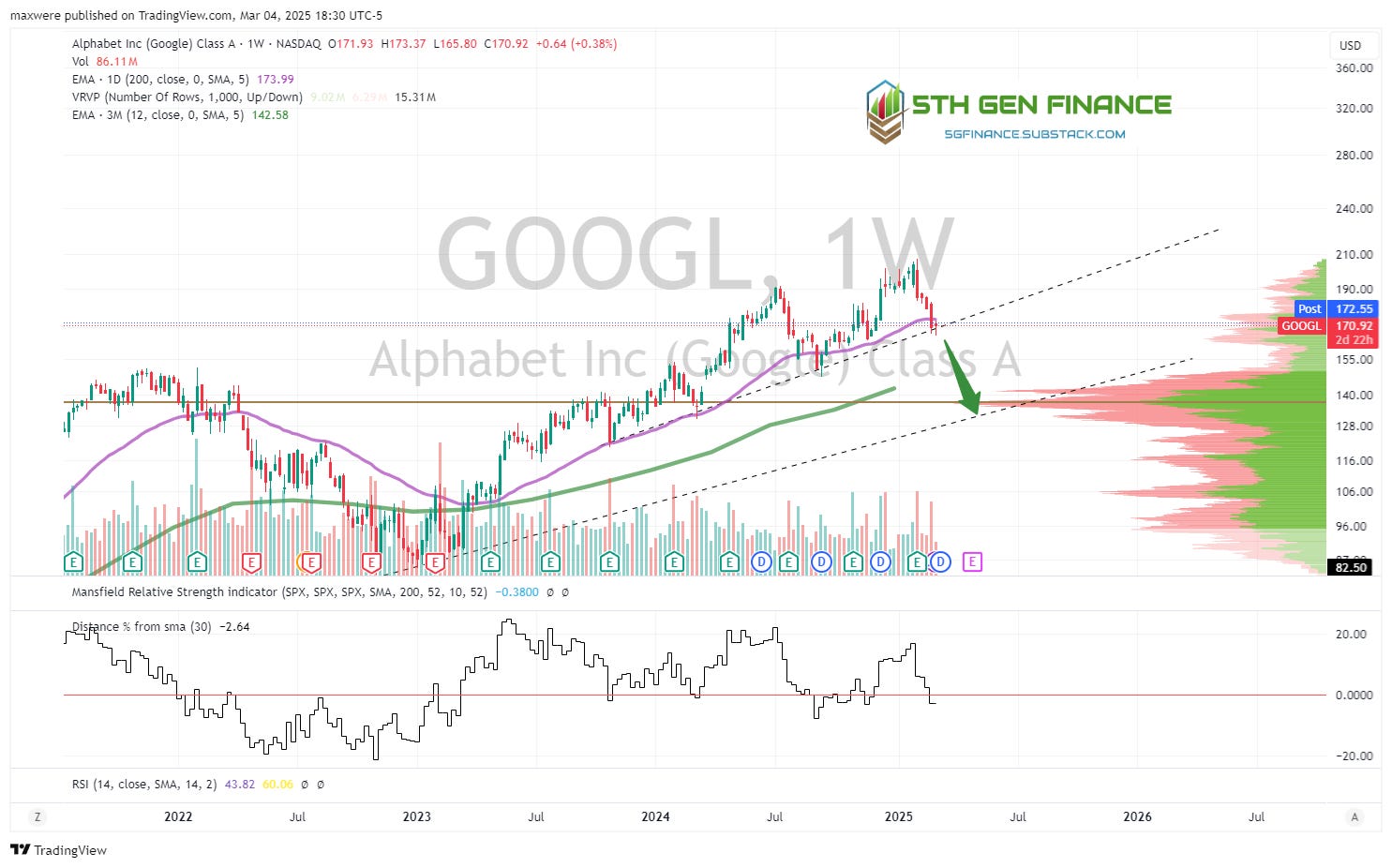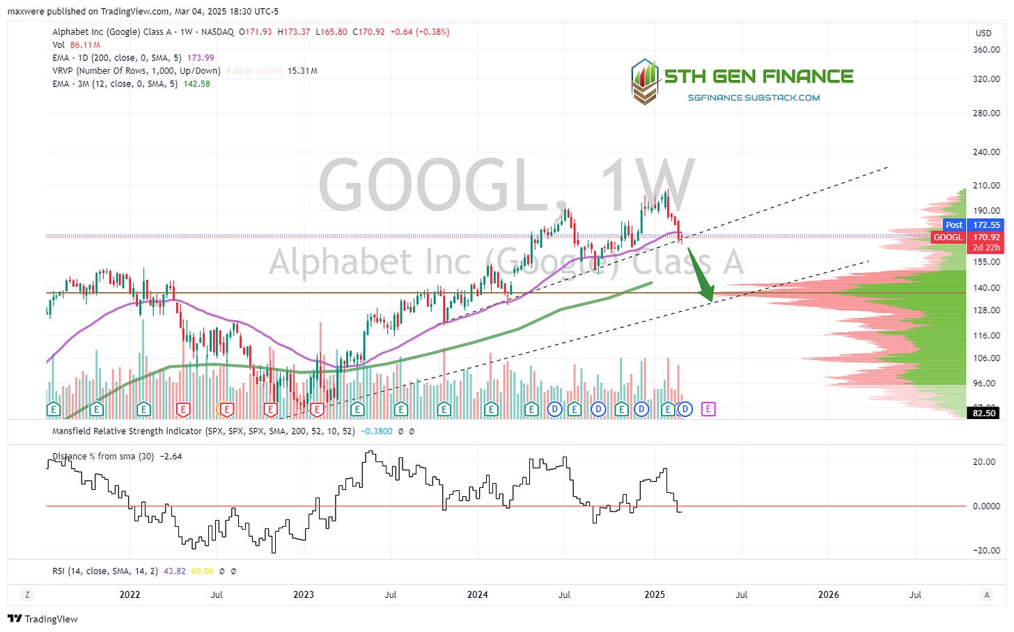 GOOGL - nearly the same as AMZN. The loss of the trend line threatens to lose a quick 20%.