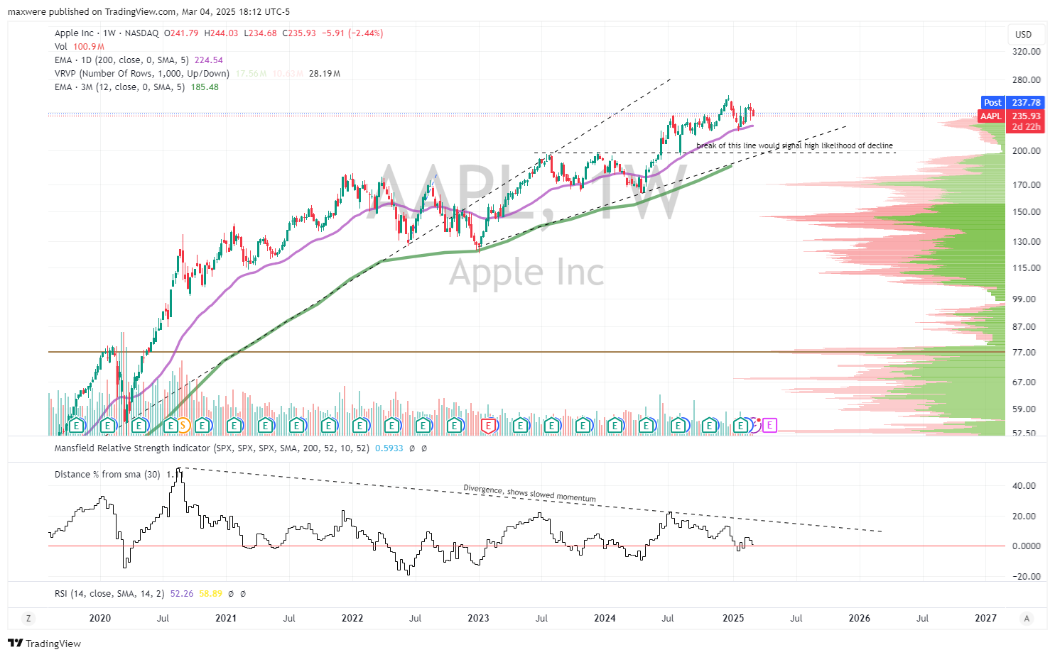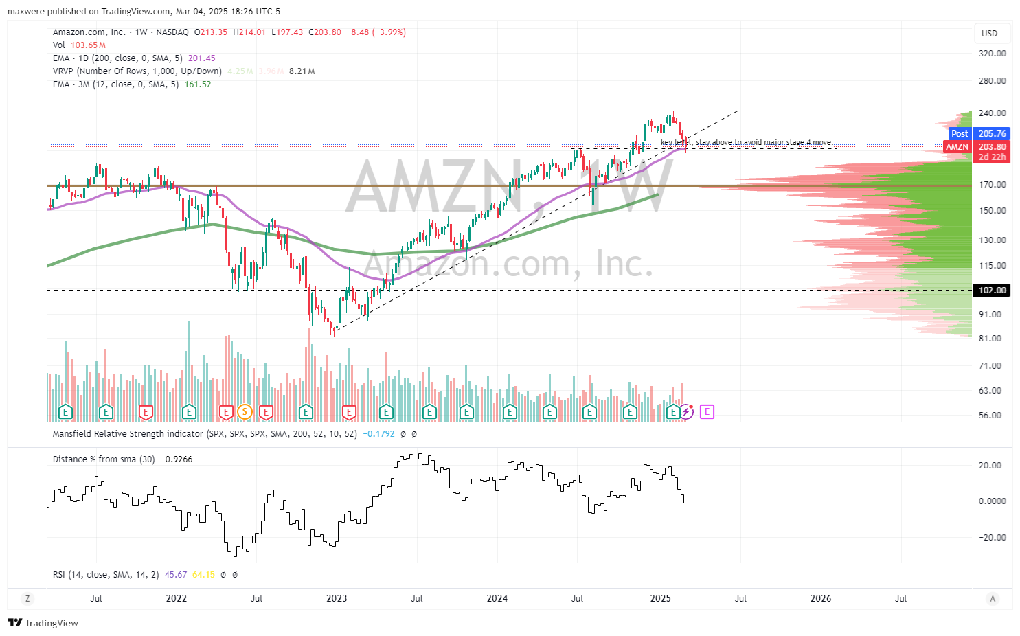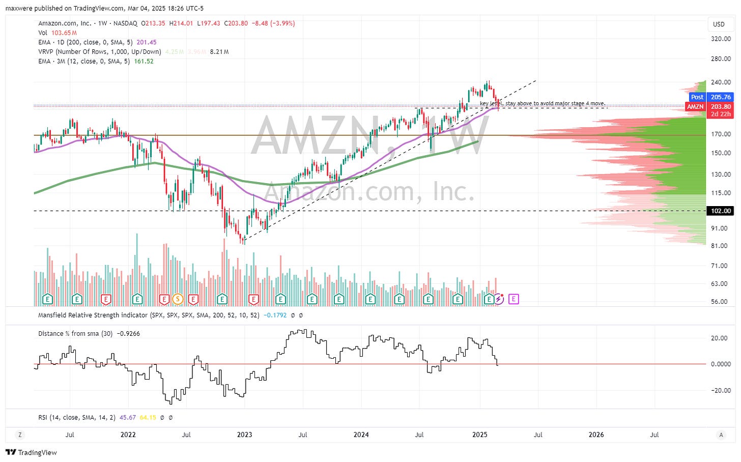 AMZN - simple chart. A battered end of this week and AMZN can lose its trend and enter stage 4. The target for that stage 4 decline is roughly -40%.