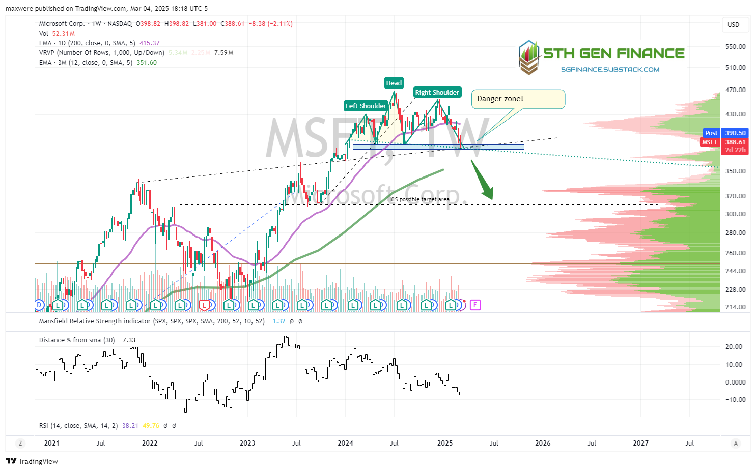 MSFT - on the cusp of a H&S top. This is a very tenuous zone here. If this is triggered in the next week or two, it likely translates to a fairly quick 20% selloff. Not the end of the world, but a significant data point.