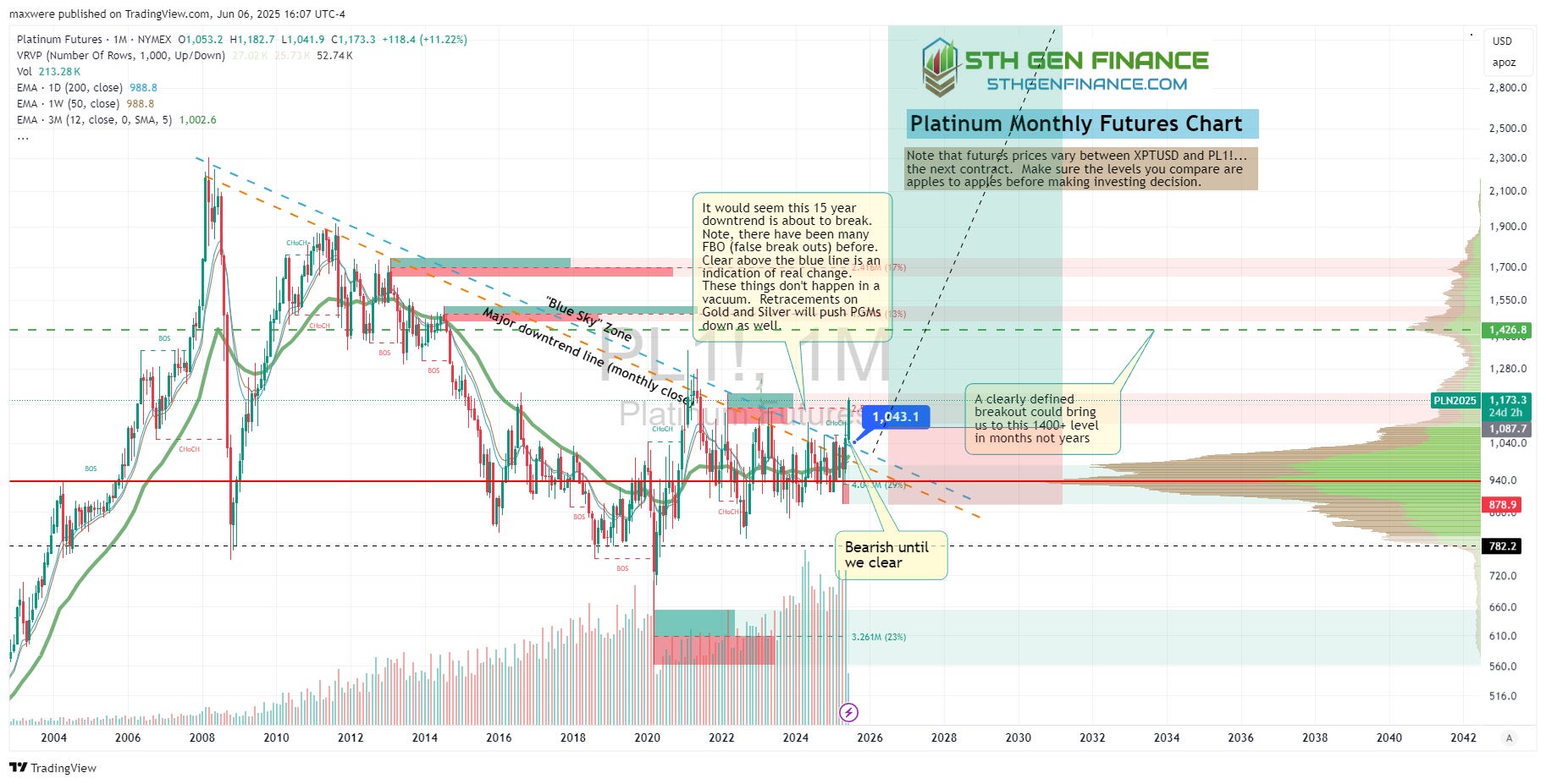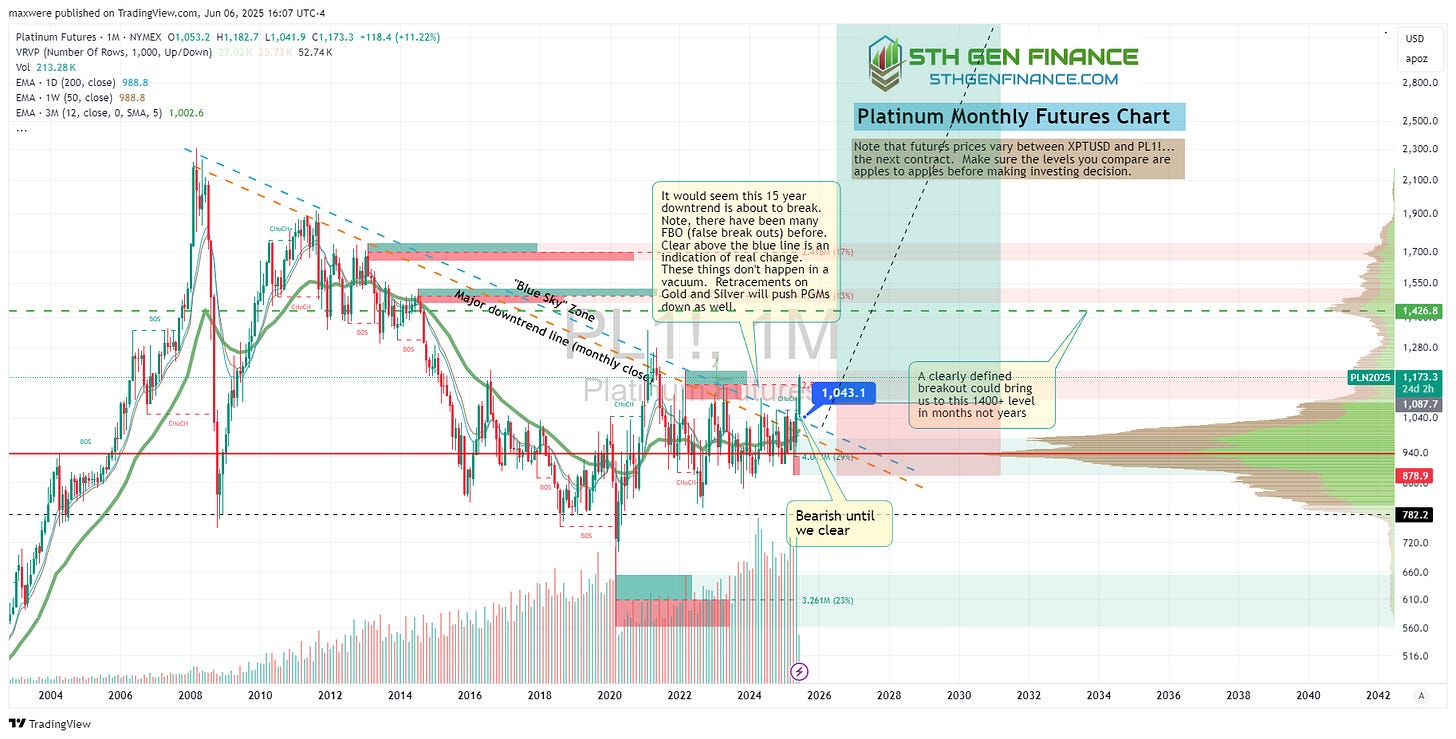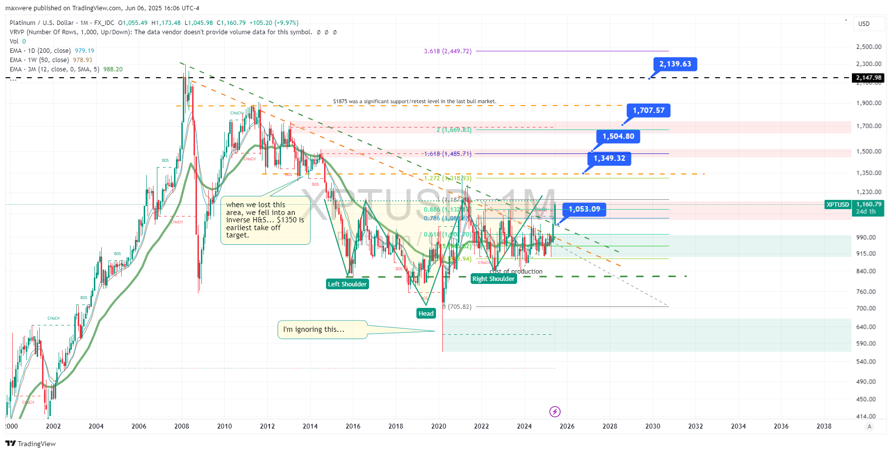 Level 3 is probably $1875. The previous bull market recognized this as both major support and resistance during its blow off top. That is usually important during the next cycle. Finally, $2140 is major resistance top. I don’t think platinum will excede this level in the next 18 months. Over the next 5-7 years we may forget that it even existed.