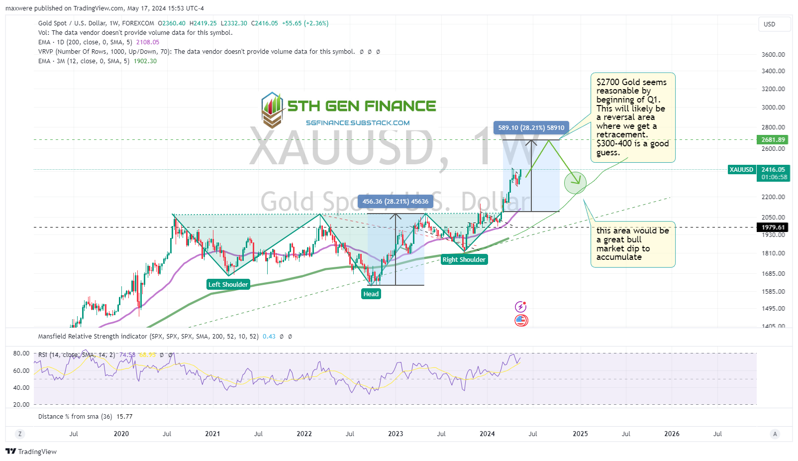 Profit targets are likely near $2700. Nothing to do but ride, for now. Will the market give us a swing back to a MA? Perhaps is on the 30-50W (purple line). I plan to re-balance at $2700.
