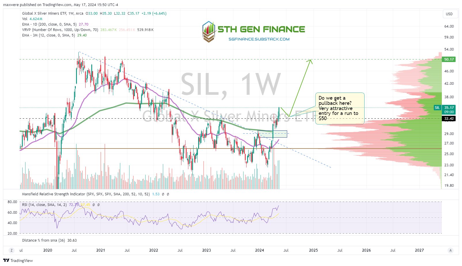 The previous peak at $50 happened at a point where silver was only $29 or so. SIL is relatively affordable, but some of the depreciation could be seen as dilution. Keep in mind the miners will likely stay in relative directional lockstep with the metal. We may not get much of a pullback in these silver companies.