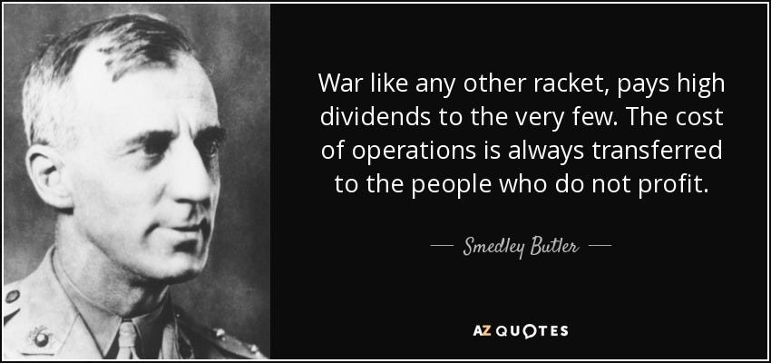"The normal profits of a business concern in the United States are six, eight, ten, and sometimes twelve percent. But war-time profits - ah! that is another matter - twenty, sixty, one hundred, three hundred, and even eighteen hundred per cent - the sky is the limit." ~ Smedley Butler