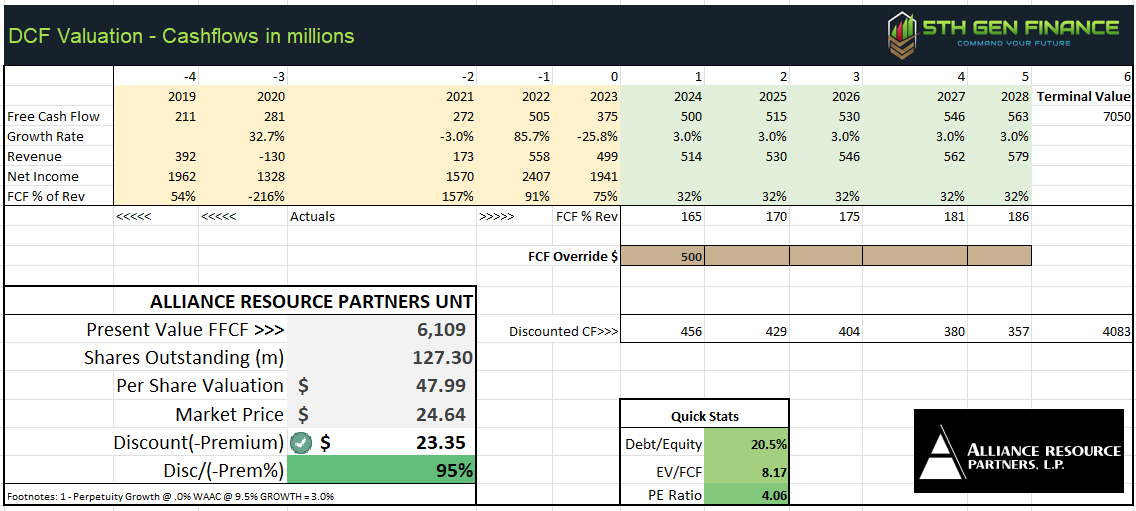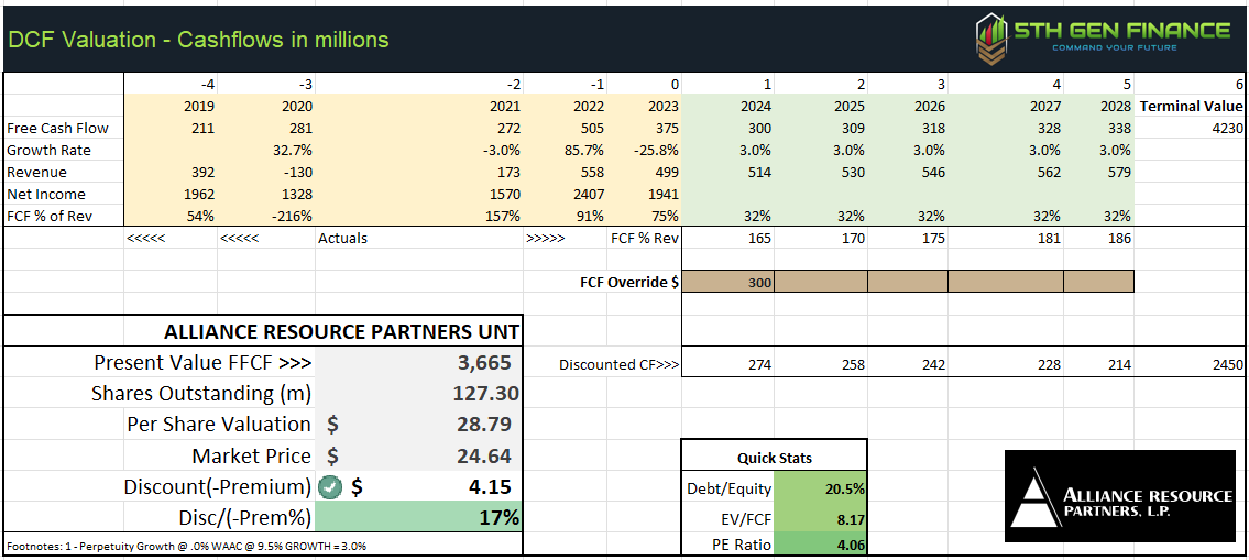 I’ve adjusted the price valuation to reflect a 300 year over year free cash flow. This a conservative estimate to roughly align with the floor of the thermal chart presented above. You can see that the current price offering is still at a discount to the conservative assumptions of 9.5% WACC and 300m FCF. This is a BUY based on fundamentals (so long as thermal prices stay above support). Keep in mine US ARLP operates in the US and US thermal inventories are healthy. Note: The perpetuity growth forecast was used in this calculation. This isn’t necessarily in line with what you think of in coal, but it projected a 12 year terminal multiple. That’s not unrealistic.