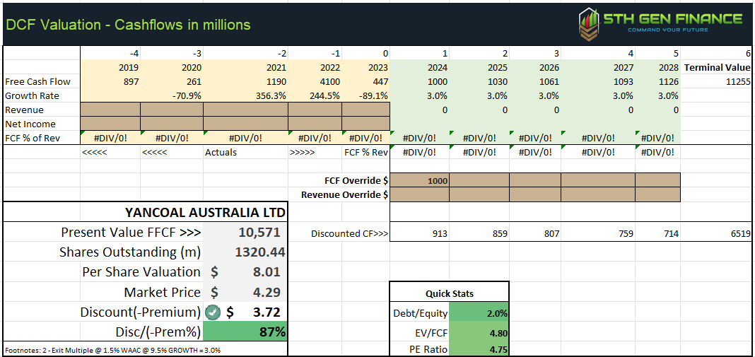 Yancoal clears plenty of cash at current prices. Assuming a 15 year terminal life, 9.5% discount and 1B USD annual cash flow, we get a price of $8. The yield is to boot! It seems this stock is a buy if the primary thermal market is in stage 1 or two. I am currently accumulating. BUY with cation.