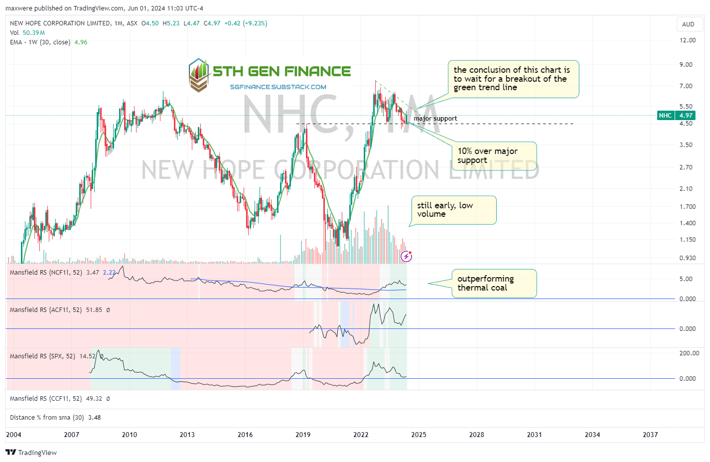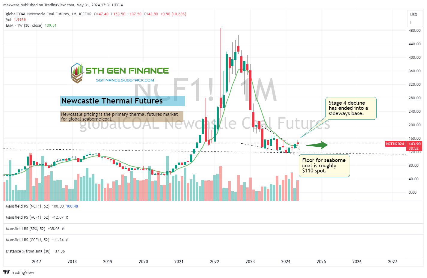Thermal coal has been sitting on long term support for several quarters now. Long term price action is clearly in stage 1. If this floor is above the cost curve, then cash flowing companies are attractive here as they will pay dividends while the stage 1 accumulation continues.