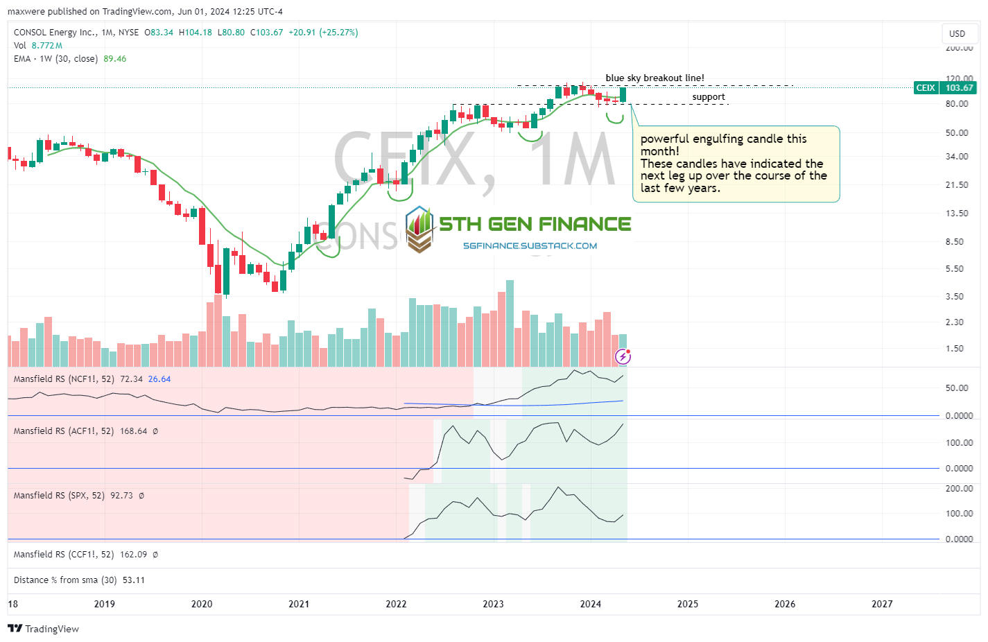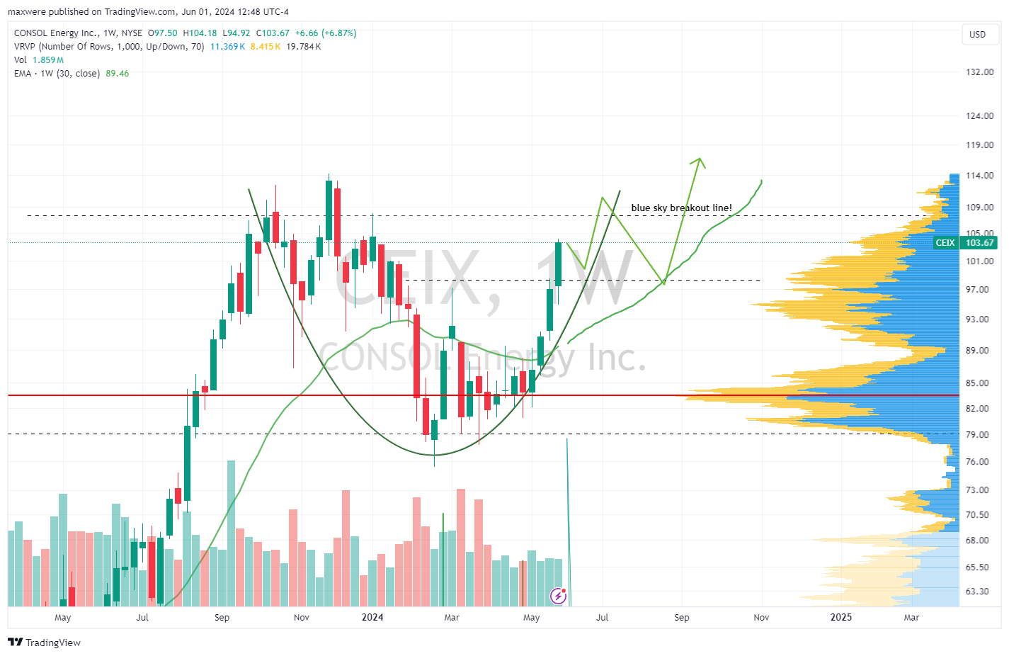 Older folks will remember this company as CNX (often seen on train cars). CNX is now a natural gas brand. The technical chart is bullish, but I’d be hesitant to buy next week. I want to see the candle pullback a bit (possibly to the 30 week moving average) on smaller time frames or break above the “blue sky line”. Consol doesn’t pay big dividends, so it helps to let the chart show us best value entries. WAIT for pullbacks or break out. EG. The chart below (weekly) is likely to form a cup and handle look prior to its breakout. A pullback of the handle to 30wma or roughly the $95-98 range should be expected over the next month.