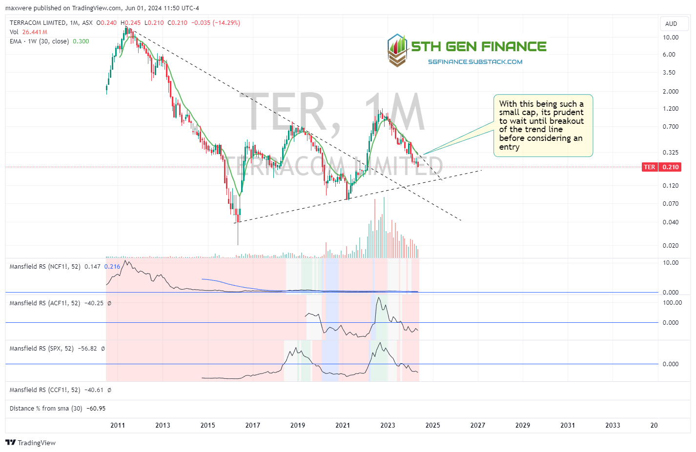 This chart looks particularly attractive to a trader alone. There is a clear breakout with clean stops and targets (a +100% move looks possible). Targets of $12 Ausie and stop of $4.50.