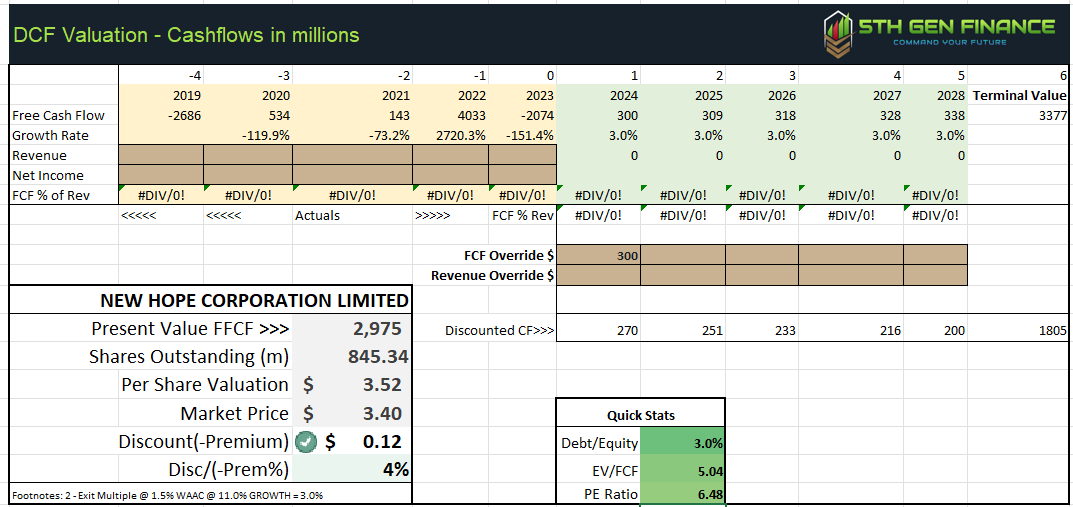NHC is currently priced at 250-300m annual FCF. This is a level they should be able to maintain as long as thermal prices stay above support. In the same way, they should maintain the 50% payout ratio as a floor. This floor is roughly equal to 5-6% yield to shareholder at this price. For the sake of this analysis, we use 300m free cash flow, 11% discount and 15 year life span as a highly conservative assumptions. The valuation should be seen as a floor.