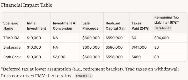 Let’s take a look at the impact on your tax liability via 3 scenarios. You did this solely in a TRAD, solely in a brokerage account and the ROTH conversion path.