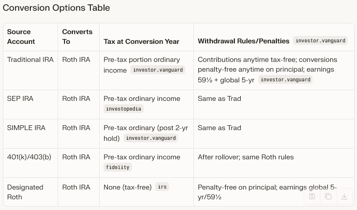 Note: Many retires may have a mix of pre and post tax retirement from the Roth 401k and so on. This introduces the “pro-rata” rule: https://www.sdocpa.com/pro-rata-rule/ This rule will lower the tax burden on the scenario you see above. Just know, its not first in last out, or pick and choose to move the post tax items first. Disclaimer: where Pro-rata rule applies; consult tax pro or financial advisor.